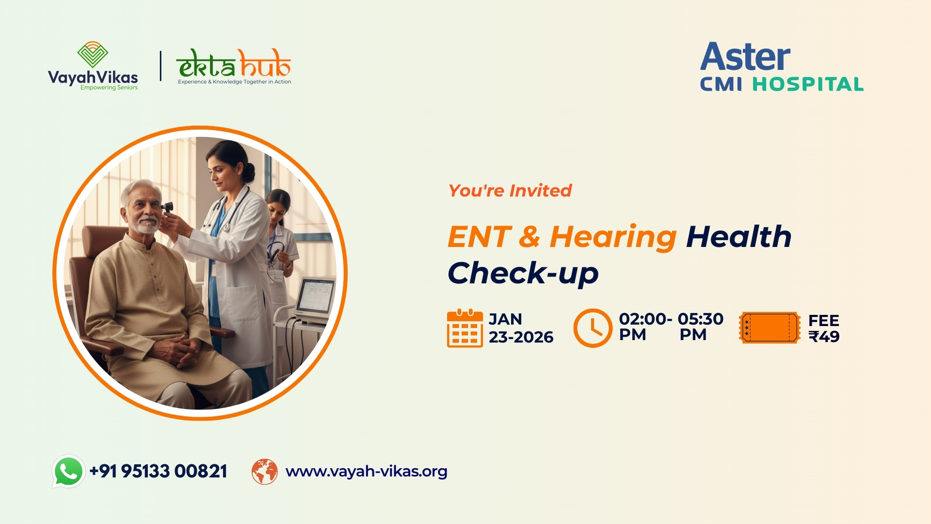 Senior ENT Specialist Dr. Vinayak Kurle from Aster RV Hospital will be available for ENT consultations between 2.30 pm and 4.00 pm.