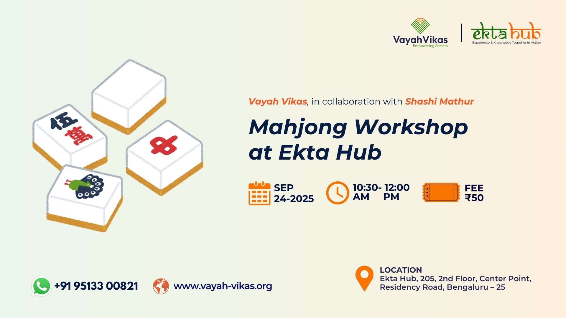 We are delighted to invite you to a special Mahjong Workshop conducted by Shashi Mathur at Ekta Hub by Vayah Vikas.