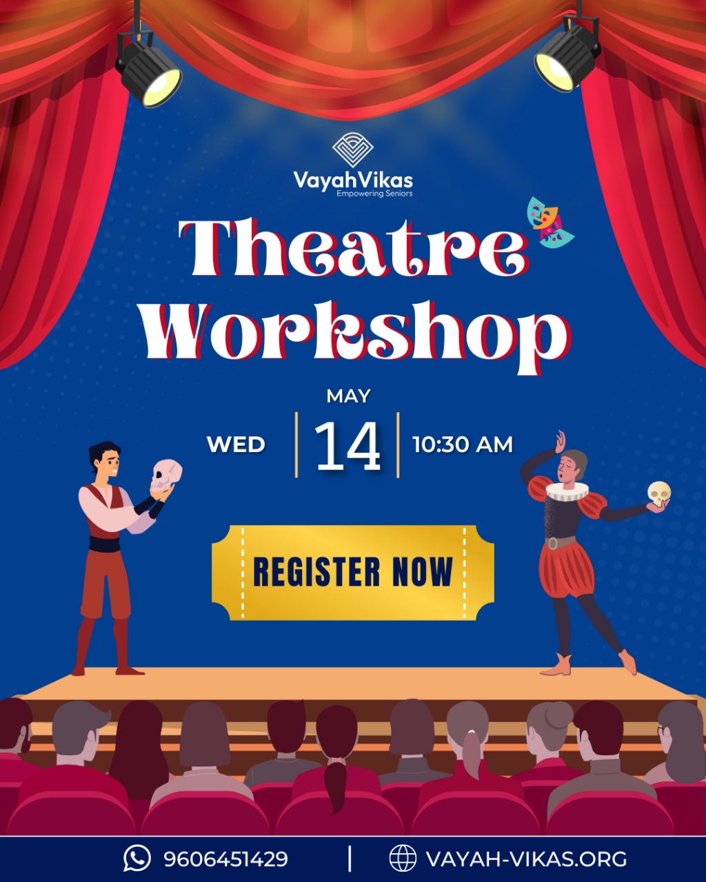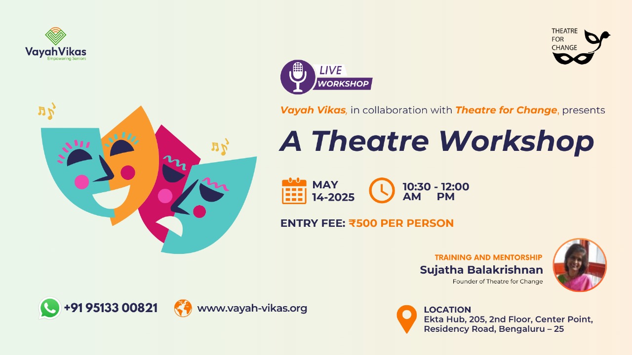 Every year, Vayah Vikas celebrates the spirit and talent of our vibrant community—and this year, the spotlight is on theatre! If you’ve ever dreamed of acting on stage or want to be part of a meaningful, creative experience, this is your opportunity. We are excited to present a theatre workshop in collaboration with renowned theatre practitioner Sujatha Balakrishnan, founder of Theatre for Change, a Bangalore-based collective that uses performance to challenge norms and amplify unheard voices. Her powerful blend of art and activism—what she calls Artivism—has inspired audiences around the world.